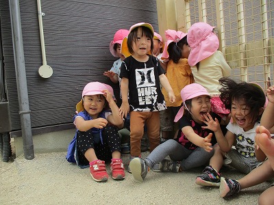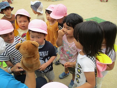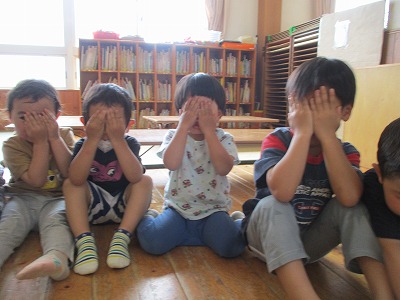 2020年05月27日 もういいかい 3歳児 つき くまさんとかくれんぼをしました。始めはくまさんが隠れてこどもたちが見つけに行きます。次はこどもたちが隠れてくまさんが見つけに行きました。隠れていても、見つけてほしいので「ここだよ~」と教えてしまうことも…。鬼の時に10数えるのも「もういいかい」と声をかけるのも楽しかったです。 もういいかい? くまさんに「見ないで数を数えてね」と言われました。ちゃんと守っているでしょう!? くまさん み~つけた! くまさんは隠れ上手でなかなか見つからなかったよ。 こどもが隠れる番です。みつかっちゃった~! 一覧へ戻る