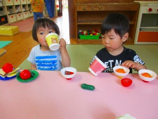 2020年05月30日 いらっしゃいませ 2歳児 にじ 朝、にじ組の部屋であそんでいる時のこと。男の子ふたりで仲良く食べ物を皿やコップに盛つけていました。 保育者がその目の前に行くと、「はい」と言いながら、どれをあげようか迷っていました。 一覧へ戻る