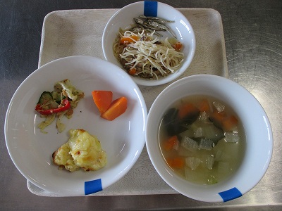 2020年06月05日 給食室(6月2日の給食、おやつ) 給食室 昼食 ・食パン ・ポテトグラタン ・人参のオレンジ煮 ・ツナサラダ ・雑穀スープ おやつ ・焼きビーフン ・煮干し メインのポテトグラタンはマヨネーズで味つけしており、 こどもたちが好きなメニューのひとつです。 ツナサラダは手作りの青じそドレッシングでさっぱりと仕上げました。 一覧へ戻る