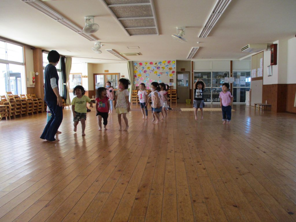 2020年06月09日 リズムをしています 3歳児 つき 毎週月曜日につき組とほし組とそら組でしていたリズムを6月からつき組だけで続けてしています。おなじみのリズムの動きやわらべうた遊びをいろいろとしています。 今回はうさぎやカメ、馬、トンボのおなじみのものから二人組でするお舟や「あらってあらって」数人で繋がる「でんでんむしでむし」などのわらべ歌をしました。つながったり、二人で向き合ったりが嬉しいこどもたちです。 一覧へ戻る
