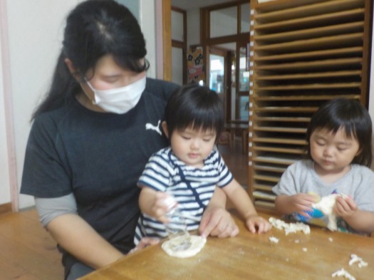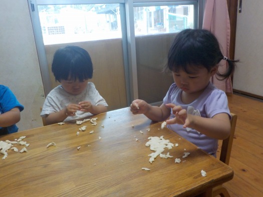 2020年06月12日 小麦粉粘土 1歳児 ゆき 小麦粉粘土をしました。 小麦粉を触ってみると、手に白い粉がついて「なにこれ!?」というような表情でした。 粘土をちぎったりこねたり、柔らかい感触を感じています。 椅子に座り、集中して取り組んでました。 一覧へ戻る