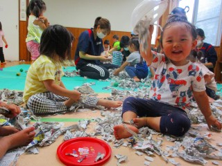 1人1枚ずつ新聞紙を渡すと早速ちぎったり、