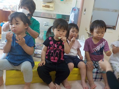 2020年06月19日 収穫しました 1歳児 ゆき 立派なきゅうりがなりました! 早速、収穫して塩もみにして食べることに。 ひとつ食べると、おいしかったのか「ちょーだい」と何度もおかわりを求めていました。よっぽどおいしかったようです。 一覧へ戻る