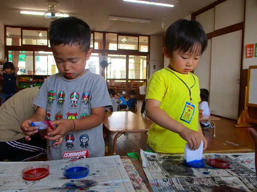 2020年06月26日 染め紙 4歳児 ほし 染め紙をしました。 半紙を小さく四角に折って、赤と青の絵の具につけて模様をつけました。 絵の具がにじんで染まっていく様子に「わー!」と驚いていました。 さまざまな模様が完成しましたよ。 一覧へ戻る