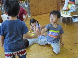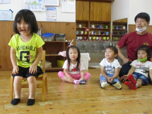 2020年06月26日 ♪こどもの王様 3歳児 つき ♪きれいな まるい 輪の中に こどもの王様いらっしゃる~♪ という曲で王様役を変わっていく遊びをしています。 ♪はじめに立っておじぎして~それからぐるりと回ります。 円の中心のこどもは立ったりおじぎしたり次に変わる人を決めたりします。 いっぺんに全員はできませんが、次は自分の番かなと楽しみにしながら続けています。 はじめに立って お辞儀をしようとしているところです。うたに合わせて上手に身振りができます。 タッチして交代。次はだれに変わろうか考えるのも楽しみです。 一覧へ戻る