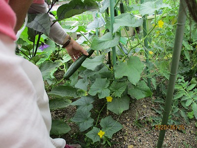 つき組の植えたキュウリが実をつけ、収穫できるようになってきました。