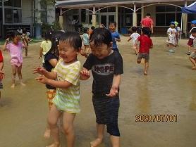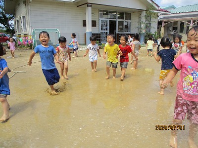 2020年07月04日 泥んこあそび&水あそび 3歳児 つき どろんこ服に着替えて、シャワーあそびから、できた水たまりで泥んこまみれになって遊びました。 ホースからの水がかかっても平気なこどもが大半です。 どの子もホースの口の方に果敢に迫ってきました。 シャワーや着替え、身体の拭き方等毎日繰り返すうちに、だんだん短い時間でできるようになっています。 体調を整えて晴れの日にはたくさん遊びたいです。 シャワーあそびでこんなに水たまりができたよ。 シャワーがかかってもへいきだよ~ 一覧へ戻る