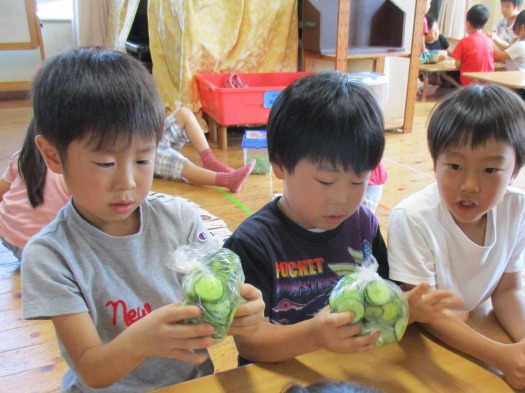 2020年07月04日 きゅうりの塩もみ 5歳児 そら きゅうりの塩もみをしました。 保育者がきゅうりを切っていると、「きゅうりの匂いがする」とすぐに興味をもっていました。 一人10回づつかぞえながらもみました。 給食の時に出来上がったものをみんなで食べました。 一覧へ戻る