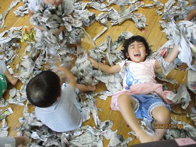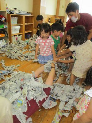 上から振りかけたり、身を隠したり、新聞を棒状にしたものを持って引っ張りっこしたりと遊び方はいろいろ。部屋中新聞だらけになりましたが、片付けもみんなであっという間にビニール袋に4つも5つも集めることが出来ました。