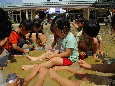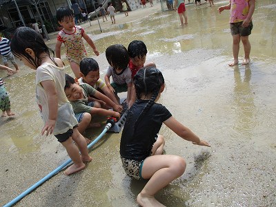 2020年07月17日 スプリンクラー登場 3歳児 つき ホースのシャワーとスプリンクラーの動きのある水が登場しました。 スプリンクラーの水の出口を触ってしぶきを浴びて大騒ぎしています。 また、できた水たまりも格好の遊び場です。 水たまりには洗剤のスプーンやカップを持ち込んで、くんだりこぼしたりと引き続きたくさん遊びました。 だんだんダイナミックになってきます。 水たまりの水で水遊びも楽しいです。 スプリンクラーのしぶきは動きます。水の出口を触って嬉しいこどもたちです。 一覧へ戻る