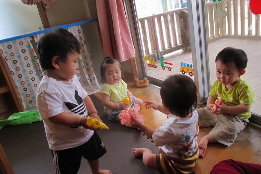 2020年07月17日 井戸端会議!? 0歳児 はな たまたま近くに集まったこどもたちは、一人の子が持ってきた ネズミの玩具を渡し合いっこ。みんなそのネズミが魅力的に見える こどもたちでした。 一覧へ戻る