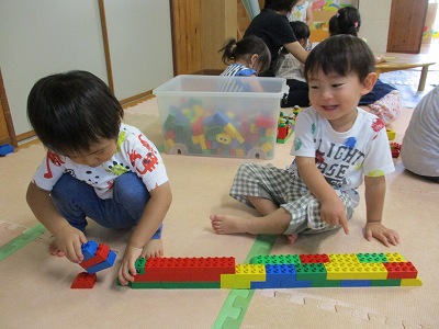 2020年07月17日 何ができるのかな? 2歳児 にじ ブロックを出すと、友だちと一緒にブロックを長くつなげていました。 そして、長くつなげたブロックを車のように動かして遊んでいました。その姿を見て、「何をつくっているの?」と聞くと、「新幹線」と応えてました。 イメージもって作っているんですね。 一覧へ戻る