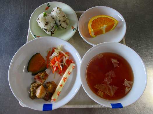 2020年07月30日 給食室(7月28日の給食、おやつ) 給食室 昼食 ・食パン ・鶏肉の香草焼き ・かぼちゃのソテー ・キャロットサラダ ・ミネストローネ ・スティックチーズ おやつ ・焼き枝豆と塩昆布のおにぎり ・オレンジ 鶏肉の香草焼きはバジルが入っているため香りがよく、 こどもたちに人気でした。 また、コンソメ味のミネストローネもこどもたちに人気のメニューで、 すべてのクラスが完食でした。 一覧へ戻る
