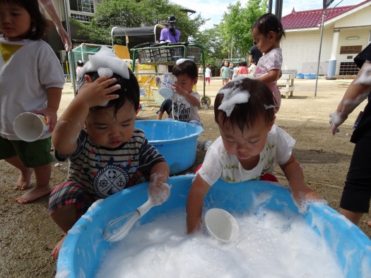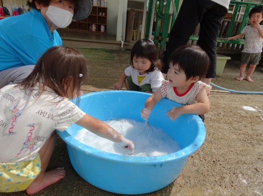 2020年07月30日 あわあわ! 1歳児 ゆき 泡立て器でシャカシャカとかき混ぜ、たくさんの泡を作ります。 泡をすくって「あわあわ!」と嬉しそうに笑っていました。 腕や頭にも泡を乗せ、泡まみれになって遊ぶこどもたちでした。 一覧へ戻る