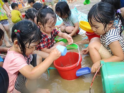 みんなでバケツに水を集めたり、友達と一緒にお城を作ったり、いつもと違う砂場に夢中のこどもたちでした!