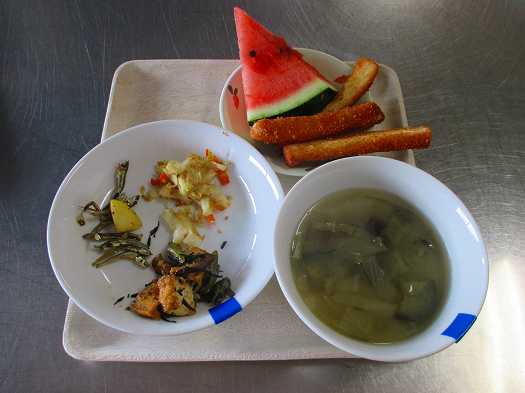 2020年08月06日 給食室(8月3日の給食、おやつ) 給食室 昼食 ・ごはん ・厚揚げと鶏肉のひじき煮 ・煮干しとじゃがいもの佃煮 ・キャベツのごまポン酢和え ・なすのみそ汁 おやつ ・シナモン揚げパン ・すいか 月曜日は和食です。 今回は和食の中でも ザ・昔ながらのメニュー でした。 あまり食が進まない子もいましたが、ひじき煮や佃煮など、 日本の伝統的な料理もこどもたちに伝えていき、 色々な料理、食材に興味を持ってもらえたらなと思います。 一覧へ戻る
