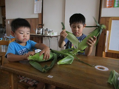 2020年08月06日 とうもろこしの皮むき 4歳児 ほし 給食室の手伝いで、とうもろこしの皮むきをしました。 「今日はみんなにとうもろこしの皮むきをしてもらうよ」と知らせると、「するする!」と張り切っていました。 丁寧に一枚ずつ皮をむき、とうもろこしのひげがでてくると、実際に顔につけたり、「そうめんみたい」と触ってみたり楽しんでいました。 一覧へ戻る