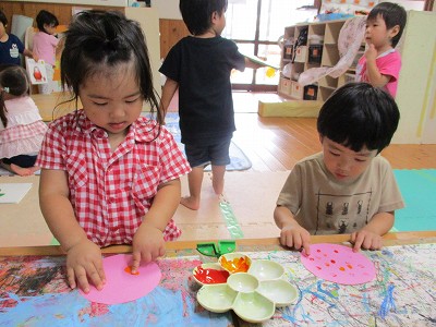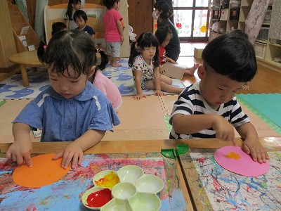 2020年08月07日 ペタペタ 2歳児 にじ 絵の具を使って指スタンプをしました。 絵の具を出すと、「黄色」「赤」という声が聞こえてきました。 人差し指を出し、画用紙全面にペタペタ。 また、完成したら室内に飾るのでお楽しみに♪ 一覧へ戻る