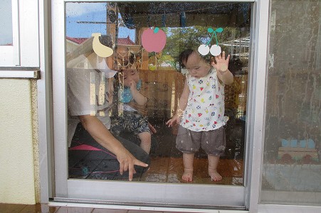 テラスで水遊びをしていると、室内で遊んでいた子が羨ましそうに見ていました。