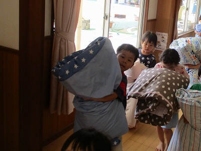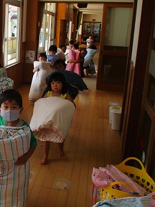 始めは、布団を抱えきれなくて床に落としてしまったり、つき組にはいるとすぐに布団を敷いて寝そべってみたりしていましたが、毎週続けているうちに、しっかり抱えて運び、つき組の押し入れに収納できるようになりました。