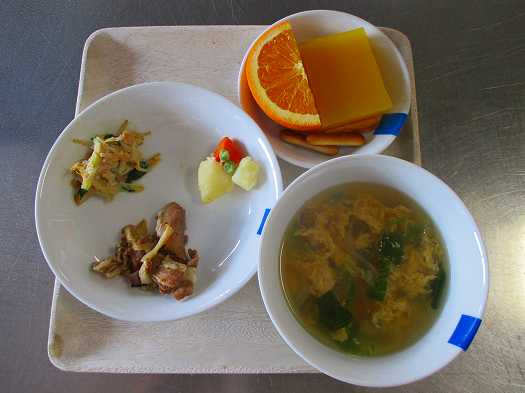 2020年08月20日 給食室(8月18日の給食、おやつ) 給食室 昼食 ・食パン ・豚肉のマーマレード焼き ・もやしのツナマヨサラダ ・じゃがいものコンソメ煮 ・かき玉トマトスープ おやつ ・オレンジゼリー ・オレンジ ・シガーフライ かき玉トマトスープには、卵、トマト、レタス、豆腐が入っています。 色鮮やかで食欲がすすむ、夏にぴったりのスープです。 こどもだけでなく、大人からも人気でした。 一覧へ戻る