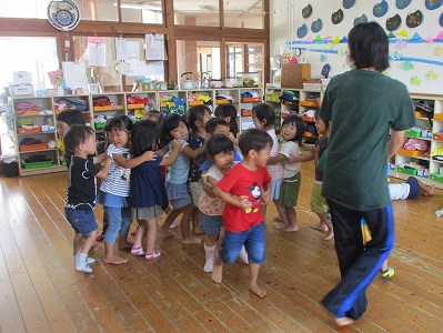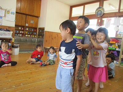 2020年08月25日 ぞうさんとくもの巣 3歳児 つき みんながつながって、だんだん人が増えていく遊びをしました。 ぞうさん役は意中の相手を呼ぶとだんだん列が長くなるのが嬉しくて つながりながらだんだん笑顔が増えていきました。 最後はぞうさんがたくさんになって、くもの巣が破れてしまう落ちも楽しいこどもたちです。 先頭の人が次の人の肩を叩いて誘います。 最後はみんなでどしんと尻もちをつきました。 一覧へ戻る