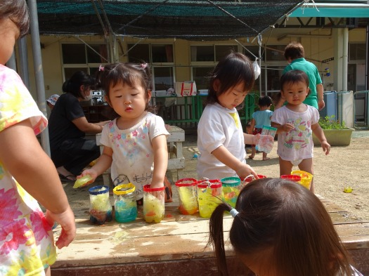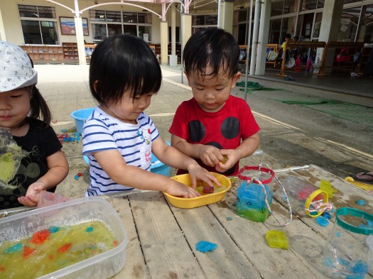 2020年08月27日 寒天であそんだよ 1歳児 ゆき 3色の寒天を用意しました。 少し触ってみるとぷるぷるしていて気持ちいいことが分かった、つぶしたりちぎったりと寒天あそびスタートです。 カップに入れてゼリー屋さんのように並べ、「はい、どうぞ」と保育者に渡すこどもたちです。 カラフルで気持ちのいい感触に、寒天をずっと触り続けていました。 一覧へ戻る