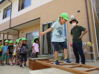 2020年08月29日 じゃんけんぽん 4歳児 ほし はしご渡りをしました。 じゃんけんをして勝った人は橋を渡ることができるというルールで行いました。 じゃんけんに負けても何度も列に並び、はしごを渡るこどもたちでした。 はしごではゆっくりと慎重に渡ったり、バランスをとりながら渡ることができていました。 今度はもう少しはしごの高さを高くしてみようと思います。 一覧へ戻る