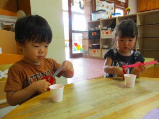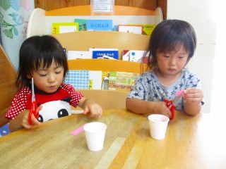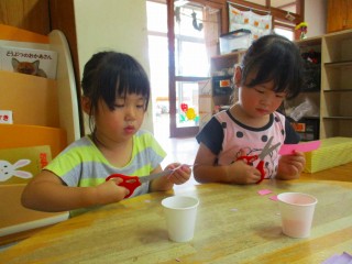 2020年09月04日 はさみを使って 2歳児 にじ はさみの1回切りをしました。 初めてはさみを使いましたが持ち方や使い方を伝えると 真剣な表情で切っていました。 指先に集中するあまり自然と口が開いてる子もいて その姿がとても可愛らしかったです。 1回切りした画用紙を使って壁面を作る予定です。 何ができあがるのか、お楽しみに♪ これからもはさみなど指先を使ったあそびを 楽しみながら指先の発達を促していきたいと思います。 一覧へ戻る