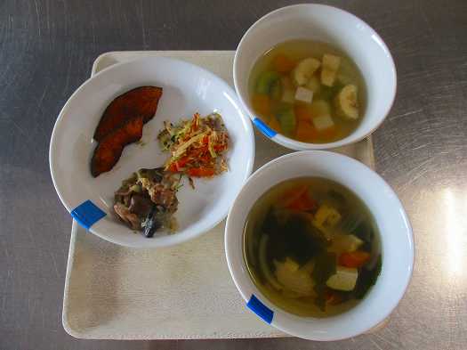 2020年09月08日 給食室(9月4日の給食、おやつ) 給食室 昼食 ・雑穀ごはん ・なすと豚肉の炒め物 ・かぼちゃの南蛮漬け ・豆苗とあみえびの和え物 ・すまし汁 おやつ ・フルーツ白玉 かぼちゃの南蛮漬けとすまし汁には 昆布とかつお節のだし汁を使用しています。 和え物のあみえびは一度ごま油で炒めたので、 香ばしく仕上がりました。 一覧へ戻る
