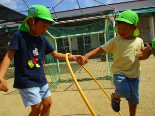 フープくぐりをする時に「友だちと手は繋いだまま次の友だちに渡していくんだよ」と知らせると、「えー、できるかな…」「やってみる!」との声が聞かれました。