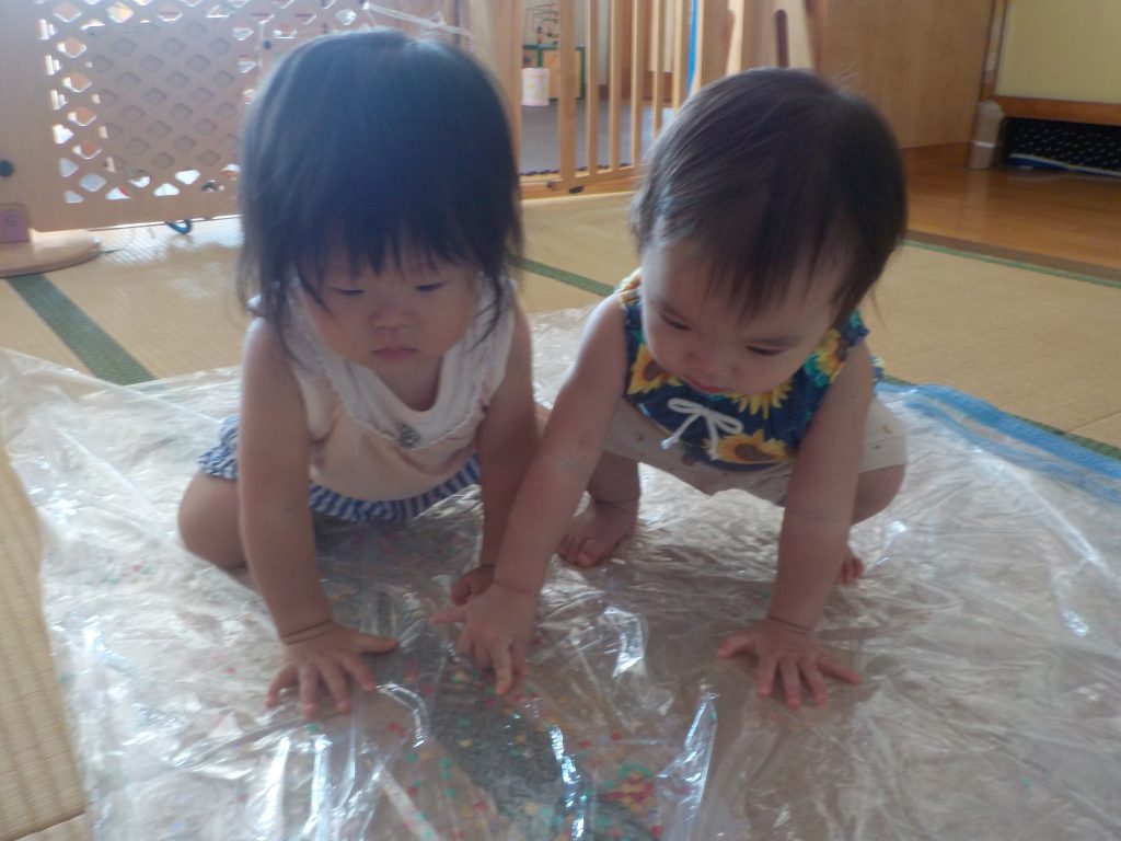 2020年09月08日 みてみて! 0歳児 はな 夏が終わってもまだまだ暑い日が続いていますが、こどもたちは毎日元気いっぱい遊んでいます。 今日は部屋で大きなウォータークッションで遊びました。 ウォータークッションの中にはスパンコールも入っているため、みんな興味津々。クッションをバシバシ叩いてる姿や寝転がっている姿も見られて、とても楽しそうでした。 一覧へ戻る
