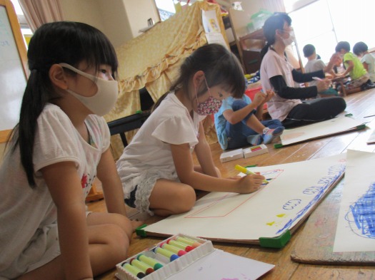 2020年09月11日 こんなことが楽しかったよ 5歳児 そら そらデイキャンプで楽しかったことを描画で表わしました。 「ダムを見たのが楽しかった」「虫や魚を見つけたのが楽しかった」「帽子とりが楽しかった」「キャンドルサービスが楽しかった」などいろいろな楽しかったことを絵にしていたこどもたちでした。 一覧へ戻る
