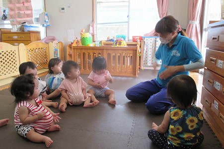 2020年09月11日 ぽんぽこぽん♪ 0歳児 はな お腹にボールを入れて、タヌキの歌に合わせて そのお腹を叩くと、こどもたちも自分の大きなお腹を ぽんぽんと叩いてはニッコリ。 誕生会で披露しようね☆ 一覧へ戻る