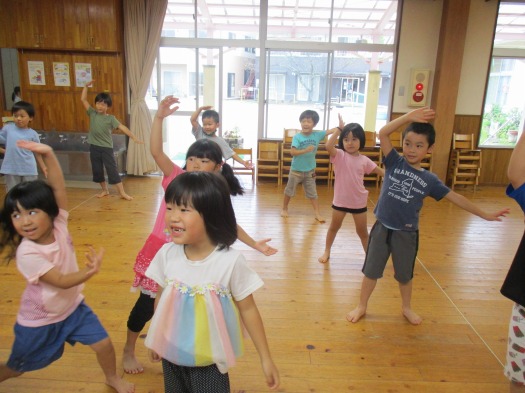 2020年09月24日 こどもカブキ 5歳児 そら 「こどもカブキ」という曲に合わせて踊りました。 踊る前に「カブキって何か知ってる?」と聞くと、「ん~…カブ?カブトムシ?」と頭の中がハテナだらけのこどもたちでした。 そこで歌舞伎の絵本を見て、まずは歌舞伎について知りました。 「顔が白い」「おもしろいポーズしとる」と色々気づきがあったようです。 歌舞伎について少し分かったところでホールに移動し、早速踊ってみました。 初めてする踊りでしたが、保育者の動きを見ながらみんなノリノリで踊っていました。 「またしたい!」と楽しかった様子のこどもたちです♪ 最後の決めポーズ!「やー!」 一覧へ戻る