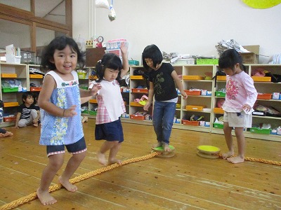 ①ロープ渡りです。カニさんになったり、前を見て渡ったりそれぞれです。楽しくて何度も楽しみました。