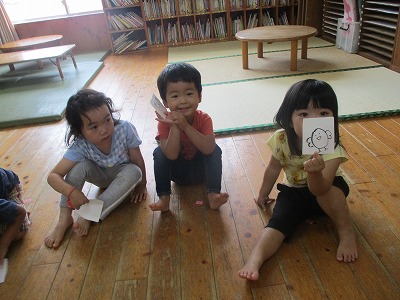 ケンケンパでお部屋まで戻り、自分のマークが隠れているのを探しました。「Aちゃんのここあるよ」「みつけた」嬉しそうなこどもたちです♪