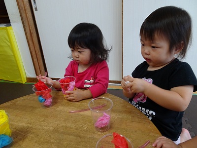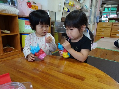 2020年10月02日 ミックスジュースのできあがり 1歳児 ゆき 未分類 手あそびの「ミックスジュース」にちなんでミックスジュースの制作をしました。 カップにいろいろな色のジュース(花紙)を詰め込みストローをさして完成♪ 手あそびの最後にも出てくるように「かんぱーい」と言いながら友だちと横に並んで飲む真似をして楽しんでいました。 一覧へ戻る