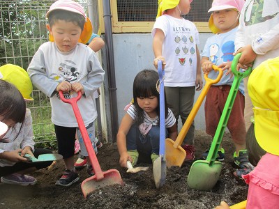 2020年10月17日 おおきくなーれ♪ 3歳児 つき みんなでスコップを持って、畑の土を耕しました。 「かたいー」「こっちは石がいっぱいある」と言いながらも、友だちと一緒に楽しそうです。 肥料を混ぜてプランターに移し、小松菜とラディッシュの小さな小さな種を蒔きました。 「大きくなるかな?」「今日食べたいな」と楽しみにしているつき組です。 水やりも毎日して、育てていこうね。 一覧へ戻る