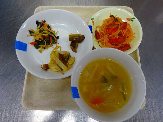 2020年10月20日 給食室(10月19日の給食、おやつ) 給食室 昼食 ・ごはん ・豚肉と春雨の炒め物 ・焼きなす ・大豆もやしとわかめの和え物 ・長ねぎと油揚げのみそ汁 おやつ ・ナポリタン メインの炒め物は豚肉の他に、春雨、キャベツ、人参が入っていて、 食べごたえたっぷりでした。 また、しょうが、にんにく、ごま油など香り豊かな食材も多く入っていたので 食欲が進む一品でした。 おたのしみおやつはソーセージたっぷりのナポリタンでした。 一覧へ戻る