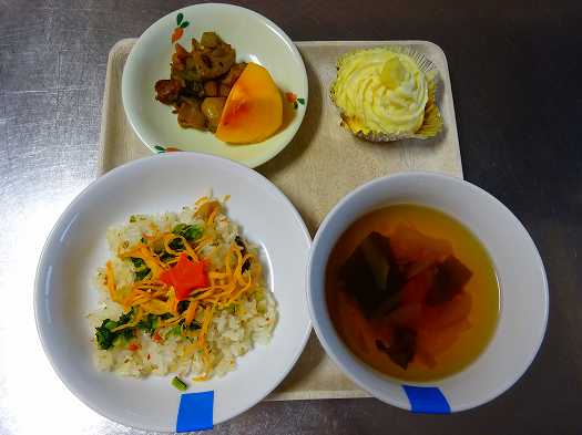 2020年10月22日 給食室(10月22日の給食、おやつ) 給食室 昼食 ・秋のちらし寿司 ・鶏肉と根菜の煮物 ・わかめのすまし汁 ・柿 おやつ ・芋モンブラン 22日は誕生会でした。10月生まれのみなさん、おめでとうござます😊 ちらし寿司は昆布だしでお米を炊いた後、しらす干しといりごまを混ぜて 酢飯を作りました。具材は、高野豆腐、干ししいたけ、小松菜、にんじん、錦糸卵です。 煮物には、ごぼう、くり、れんこんといった秋の味覚がたっぷり入っています。 昼食は食材の都合により、ぶどうから柿に変更しています。 一覧へ戻る