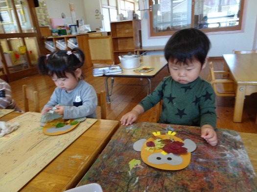 2020年10月27日 ふくろう 1歳児 ゆき ふくろうの製作をしました。 のりを指にとると、豪快にぬっていました。 ふくろうの羽は、葉っぱで飾り付け、季節を感じられるようになっています。 目のシールを差し出すと、上手に目がある位置に貼っていました。 一覧へ戻る
