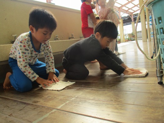 2020年10月29日 テラスの雑巾がけ 5歳児 そら 新しく、当番活動でテラスの雑巾がけを始めました。 砂がある所は、ほうきでテラスを掃いてから雑巾がけをします。 友だちと「ここに砂がまだある」と声を掛け合いながら掃いていました。 雑巾がけでは、友だちと拭く場所を分担して拭き、テラスをきれいにすることができていました。 自分たちの保育園を、きれいにするって気持ちがいいね。 一覧へ戻る