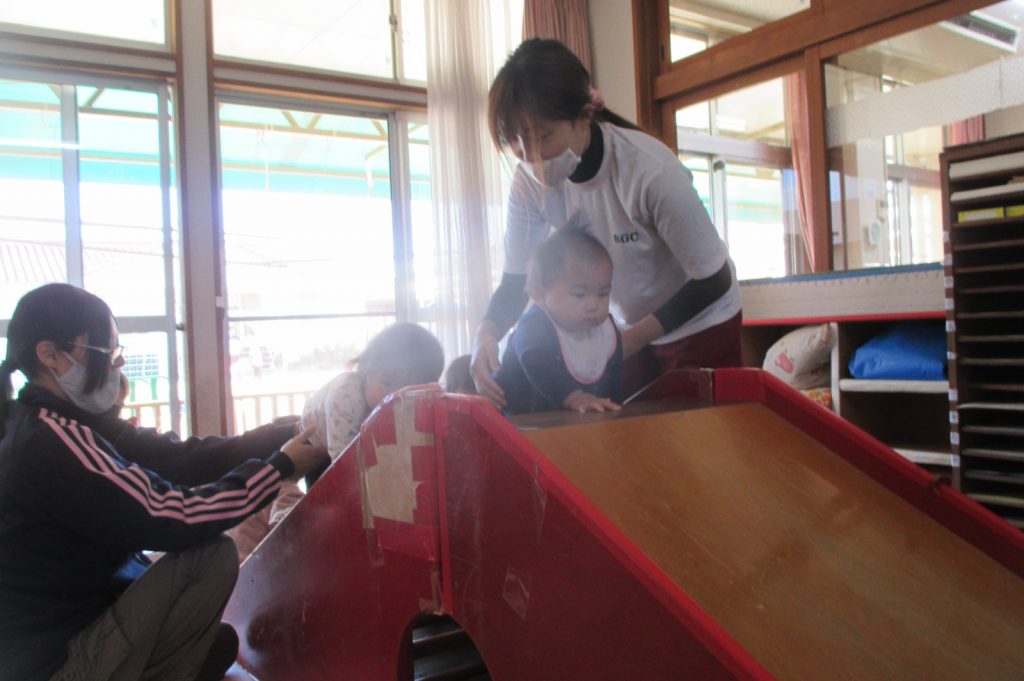 すべり台を見てすぐに興味を示して登り、自分で一生懸命上がろうとする姿が見られました。