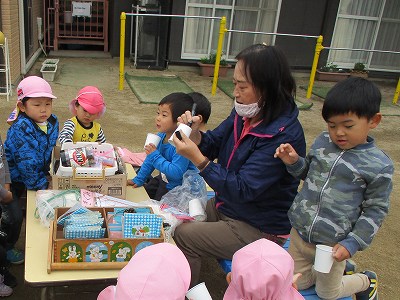 カラーマジックでの色付けも、紐についたまつぼっくりを振り上げてコップの中に入れるのも、どれも楽しみ。今日は午前中ずっと外にいて、けん玉づくりをしていない子は、サーキット遊びも楽しみました。