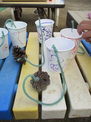 紙コップに絵を描いて、まつぼっくりのけん玉を作りました。