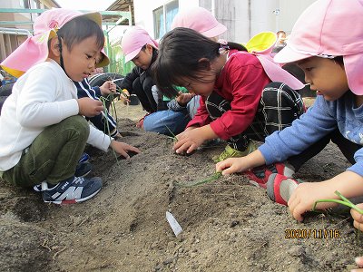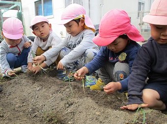 2020年11月17日 玉ねぎの植え付け 3歳児 つき 玉ねぎの苗を一人一本ずつ植えました。 白いところを土に埋める。根っこは大切にする。緑の葉の所は折ったりちぎったりしない。等気をつけながら交代で植えました。 夏野菜を植えた時のことを覚えているのか、あまり細かく言わなくても間隔を取って上手く植えていました。 玉ねぎは、4月下旬ごろから5月初旬頃に収穫予定です。みんながほし組になったら食べ頃かな? 土のお布団をふかふかにかけました。大きくなあれのおまじないもお手の物です。 苗は優しく持ってね。ねぎの匂いがするね。 一覧へ戻る