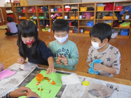 やきいもやさんと書いてある字の中に、折り紙をちぎってのりで貼ってちぎり絵のようにしました。