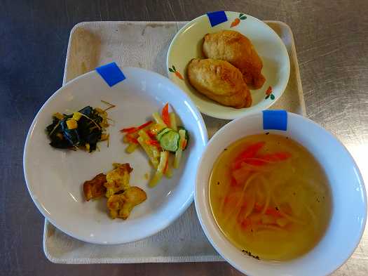 2020年11月25日 給食室(11月24日の給食、おやつ) 給食室 昼食 ・食パン ・タンドリーチキン ・わかめとコーンのソテー ・マカロニサラダ ・イタリアンスープ おやつ ・いなり寿司 タンドリーチキンの鶏肉は、お肉をやわらかくするために、 ヨーグルトをからめ、30分間置きました。 カレー粉としょうゆでシンプルな味付けになり、 食欲のそそる一品です。 マカロニサラダの具材にはきゅうり、にんじんの他にみかん缶も入っていて、 爽やかな味付けになっています。 一覧へ戻る