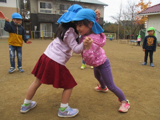 2020年11月27日 はっけよい、のこった! 5歳児 そら 朝の戸外あそびの時間に、相撲をしました。 「はっけよい、のこった」の合図で真剣勝負が始まります。 力も強くなり、バランス感覚も良くなってきて、なかなか決着がつかずいい勝負になっていました。 保育者も一緒にするなど、大人もこどもも本気で楽しんでいます♪ 一覧へ戻る